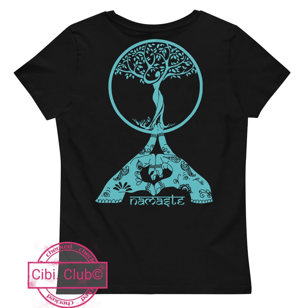 Tee-shirt coton bio F. près du corps "Namasté" Noir, imprimé turquoise